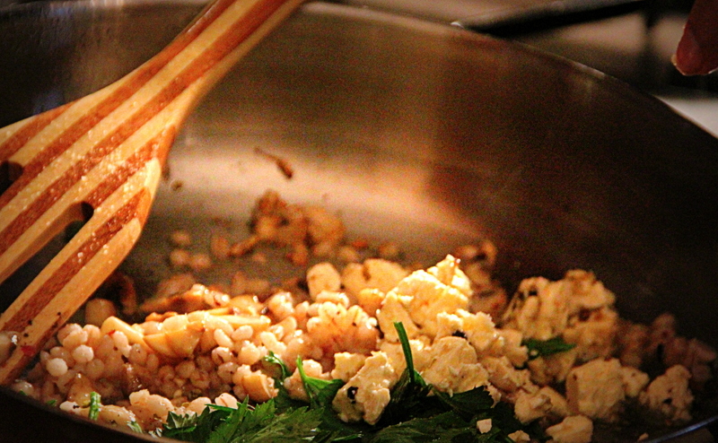 Now tumble in the rest of the ingredients. the parsley, dill, feta, pink and green crushed peppercorns, the Spanish Paprika and the drained pearl barley. Fry this all gently for a further 5 minutes, combining all the ingredients very well. Set aside.