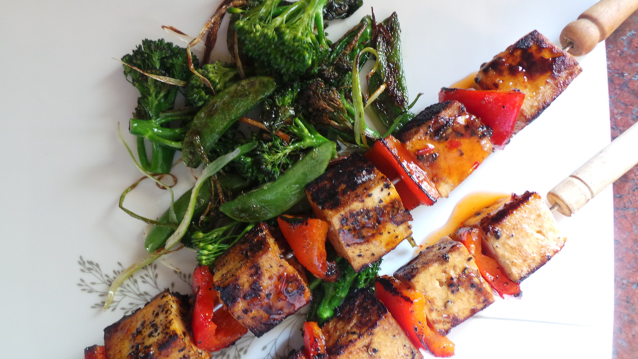 • Place the skewers in the hot oil and let them sizzle without moving for 2 minutes, before turning and rotating. Repeat this three to four times until the tofu is starting to turn a golden brown and starts to chargrill. This will take 6-7 minutes.