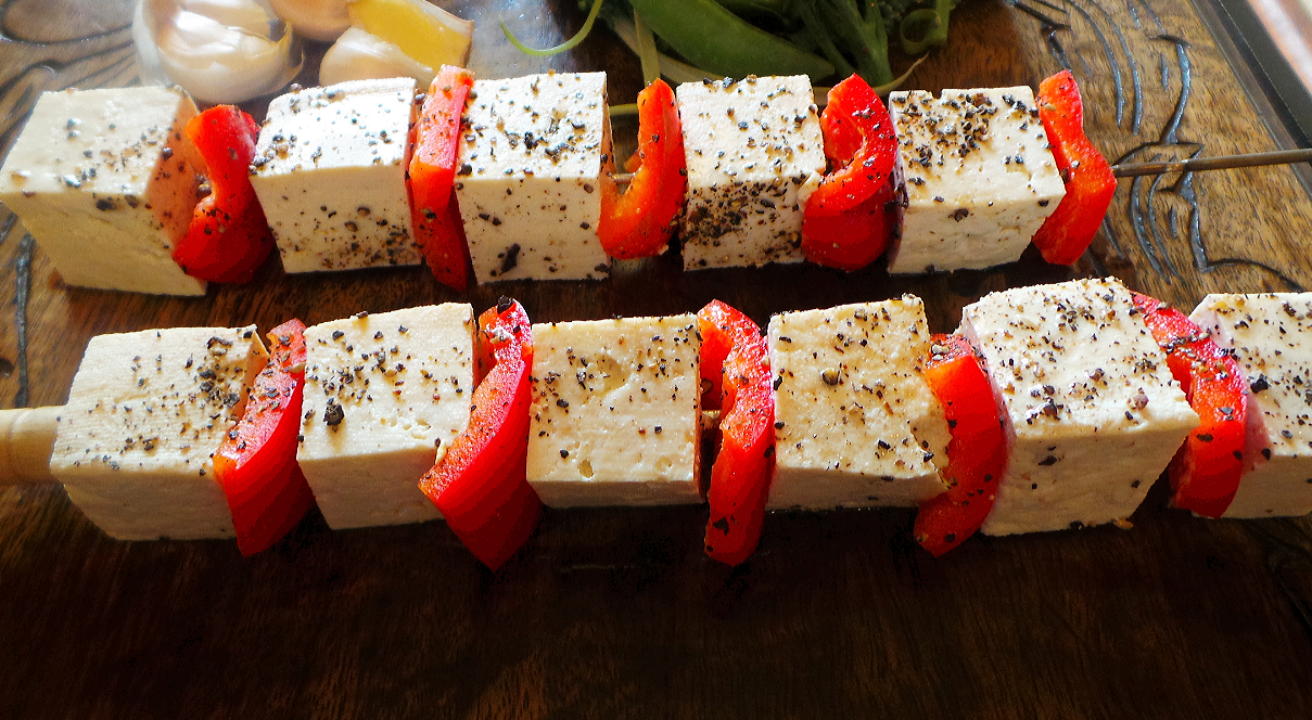 • Take four skewers and thread on a piece of tofu followed by a piece of red pepper. Make 4 skewers, one for each person.