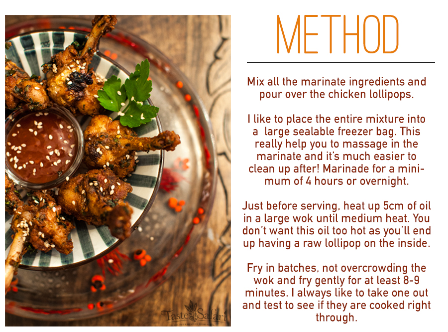 The most important part of the method is creating the ‘lollipop.’ If your butcher cant assist you, it’s really quite simple. Take a sharp knife and holding the end of the chicken wing drumstick, start to scrape the meat upwards until it reaches the end of the bone. Let all the meat gather at the top, tug slightly and gently round in shape – there’s your lollipop.