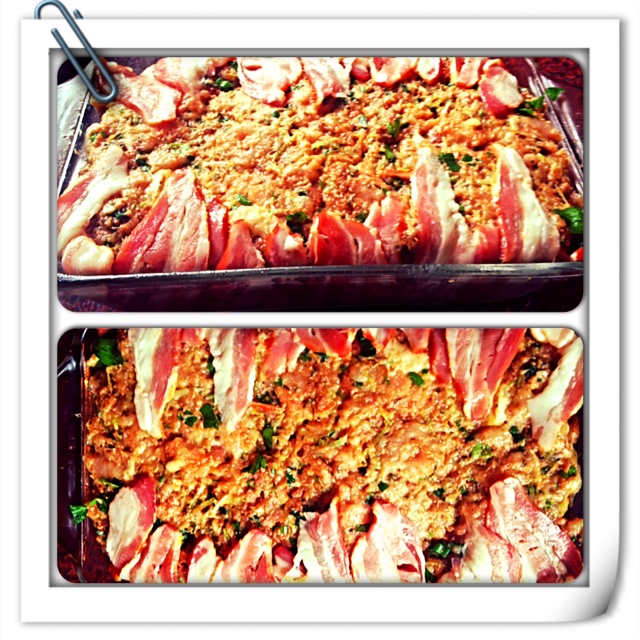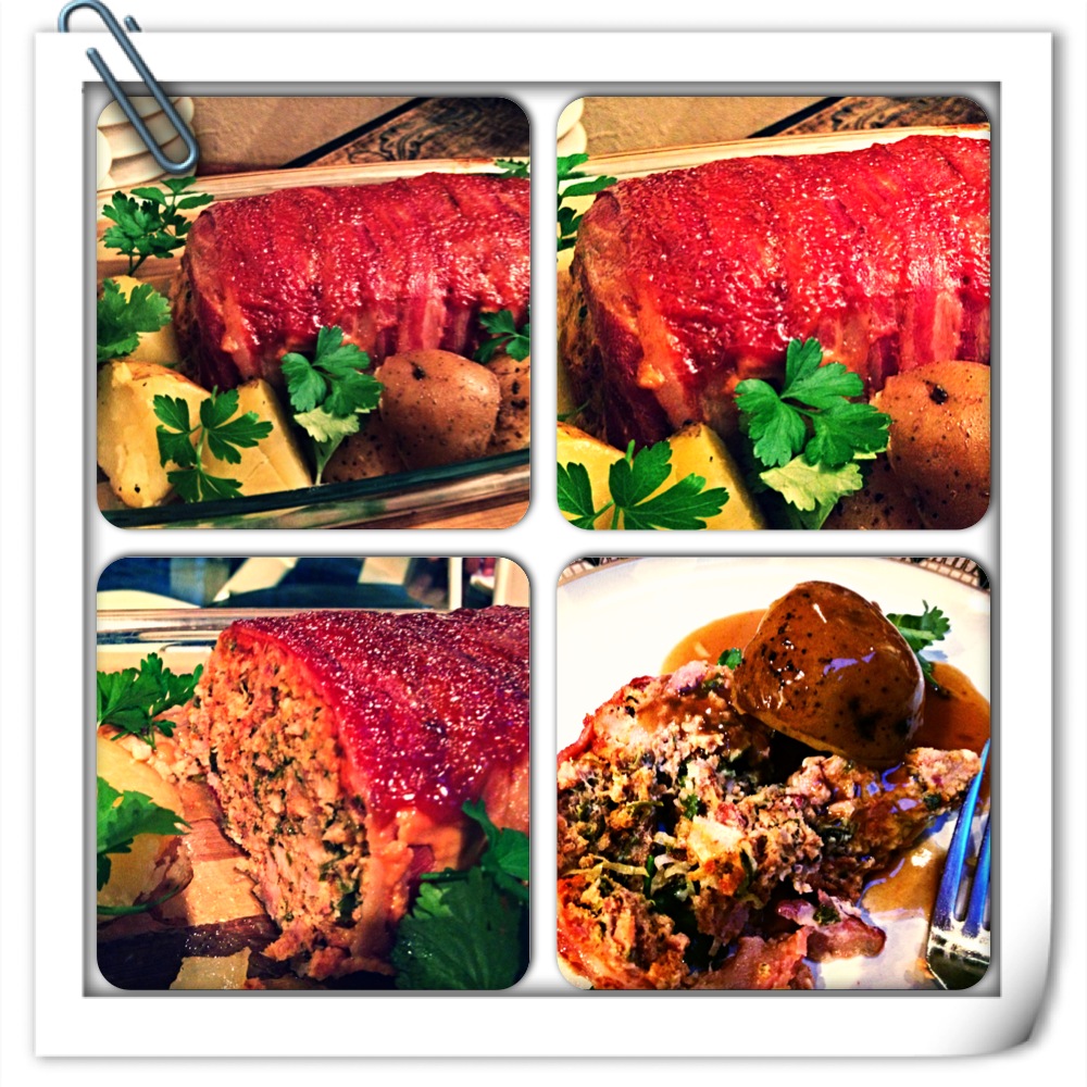 Just before serving, there is one more step and you need to be quite careful here. Remove the foil and place a large serving dish over the loaf pan. Turn it over quickly, taking care of any hot juices that might come out of the pan. ( keep these juices ) The meatloaf should now have your beautiful bacon slices on top as presentation.