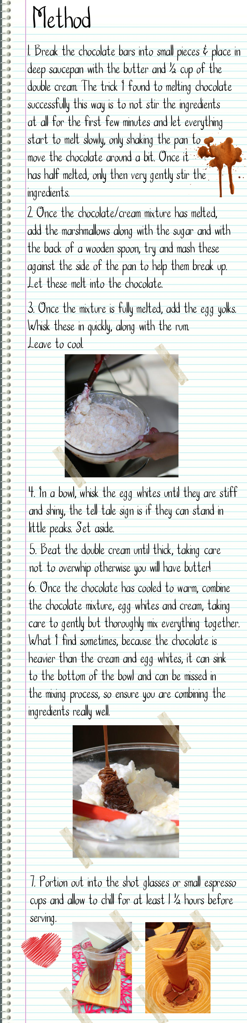 This is one of my absolute favourite recipes, because it is so simple and turns out a really sophisticated dessert. It is very decadent, so a shot glass portion is perfect. Although I really do believe in using superior quality chocolate (at least 70% cocoa content), this recipe works well with any decent regular milk chocolate.