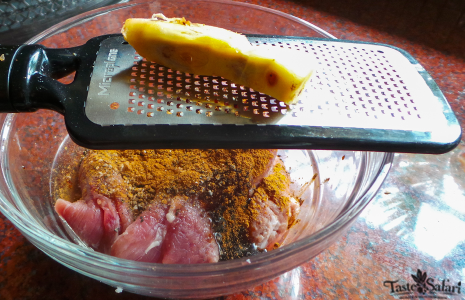 Remove the meat from the pan and let it rest on a clean chopping board, covered with foil paper. Keep the leftover marinade juices from the pan.